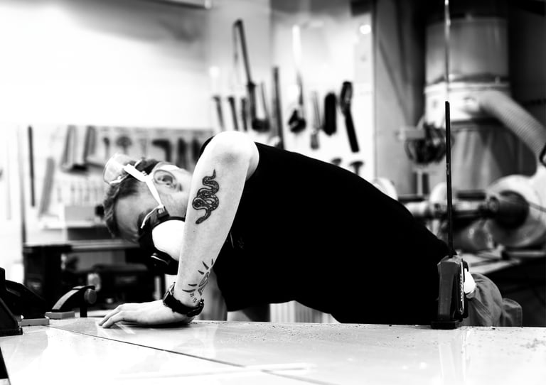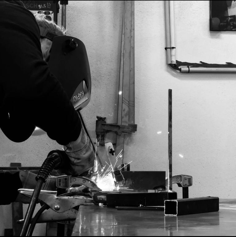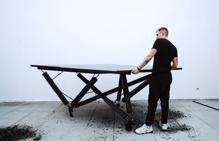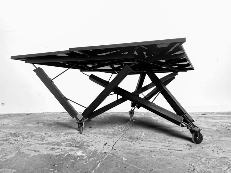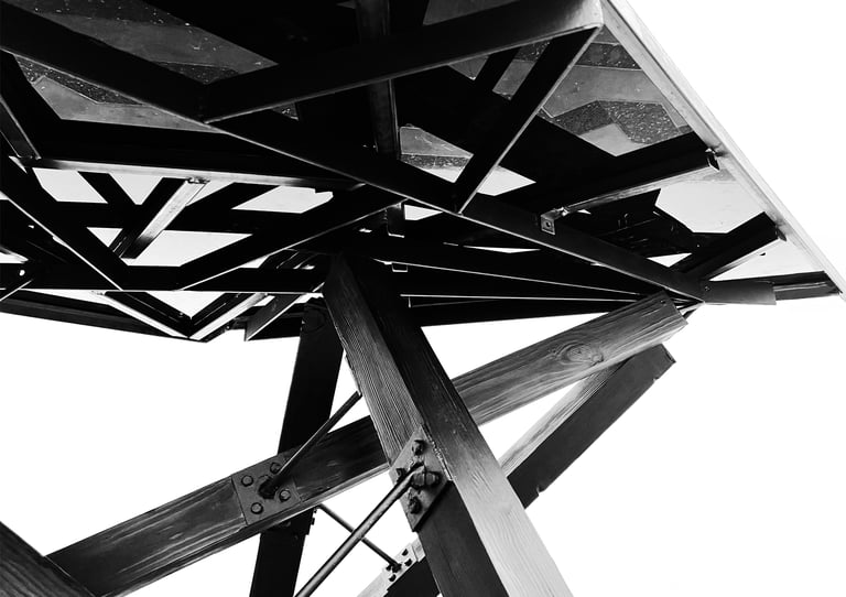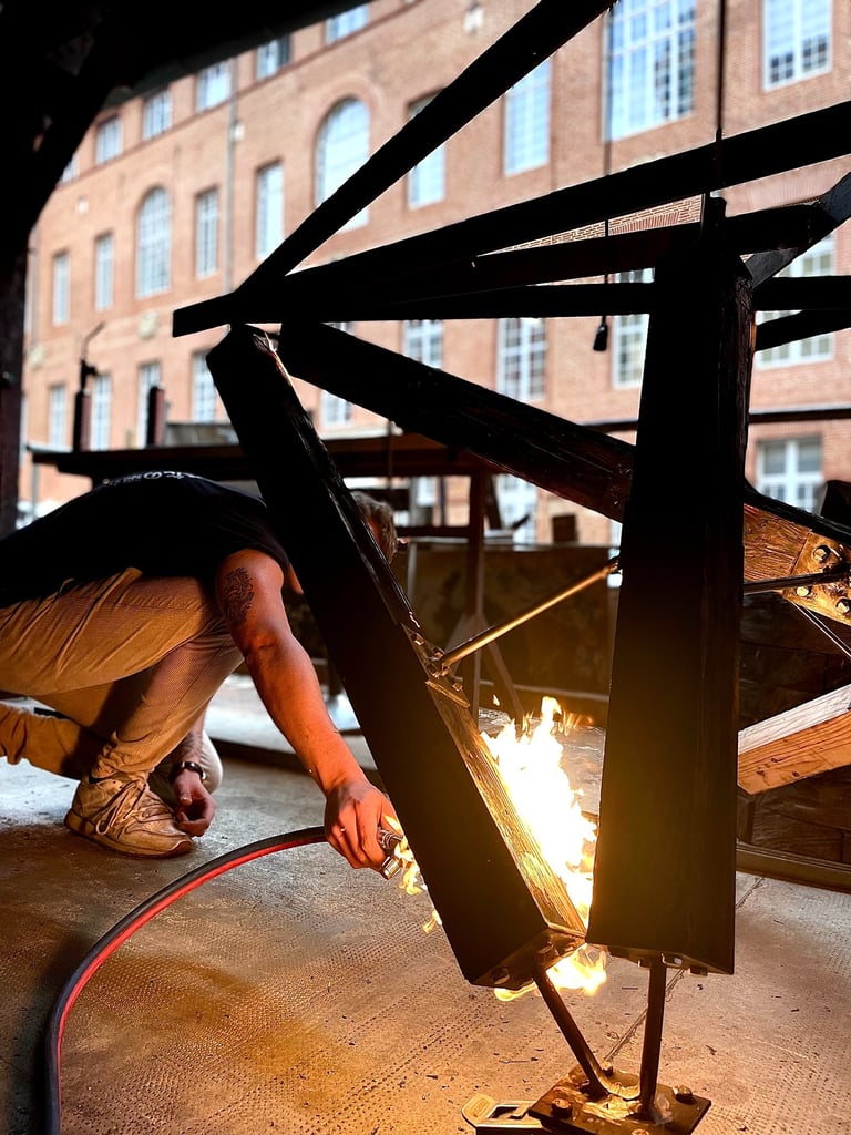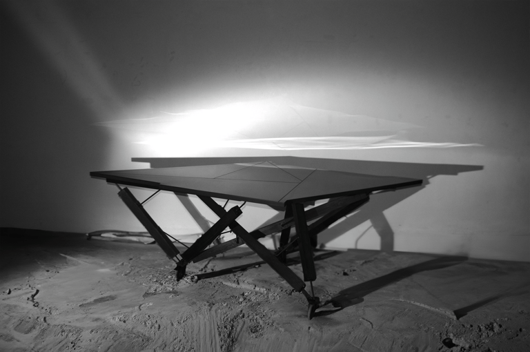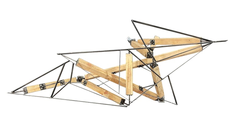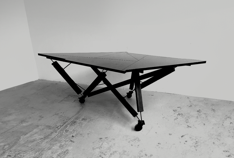 La recherche de matériaux, initiée par Michel Gary, professeur, et les étudiants de l’isdaT, s’est organisée à travers le détournement de bennes de matériaux, que nous avons étudiés puis valorisés. Dans cette dynamique, j'ai choisi de me servir de chevrons de hêtre, inutilisés par une entreprise de l’industrie toulousaine et de plexiglass teinté provenant de décors et d’expositions démontées. Comme lors d’un travail de sculpture j’ai assemblé les chevrons par des modules flexibles mais solides, puis j’ai coupé et meulé la pièce afin d’avoir un rendu équilibré et esthétique. Enfin, pour le traitement, mon choix s'est tourné vers le « shou sugi ban », une technique japonaise ancestrale consistant à brûler le bois.