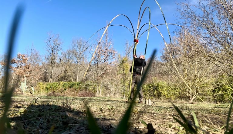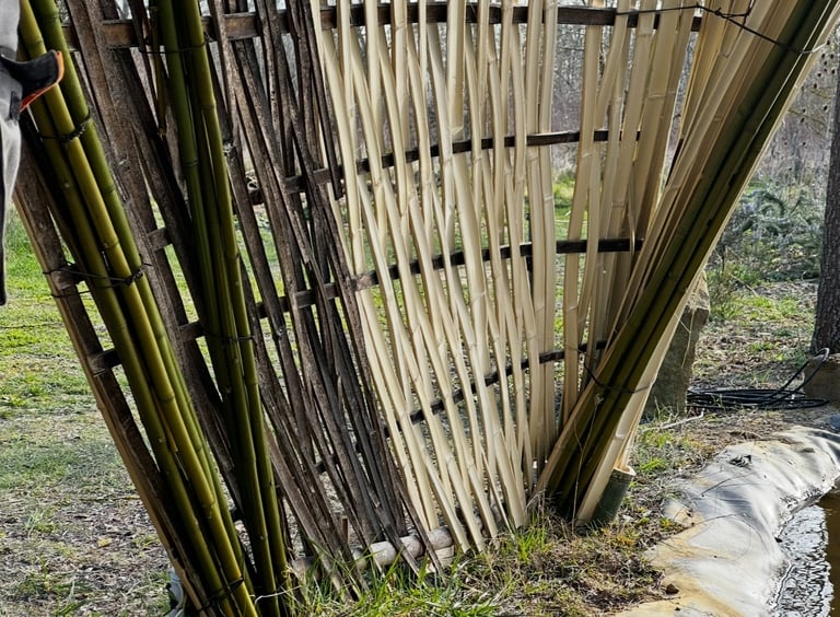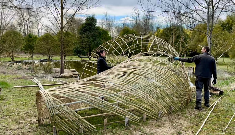 Cette construction est née d’un échange simple et essentiel : bâtir avec ce que le lieu offre, en contrepartie d’un geste, d’un savoir-faire. Le bambou, cultivé dans le parc, a été mis à disposition pour donner naissance à plusieurs projets dans d’autres localités. En retour, il s’agissait d’habiter le lieu, de transmettre, de construire à la main, dans un esprit de troc, de réciprocité, et de respect du vivant.