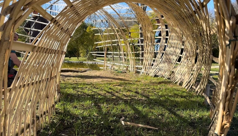 La structure, à la fois légère et expressive, se fond dans le paysage tout en affirmant une présence douce et accueillante. Elle mêle des techniques venues d’ailleurs à des gestes inventés sur place, fruits d’un dialogue constant entre les savoirs dits traditionnels, les expérimentations contemporaines, et les personnes rencontrées en chemin.