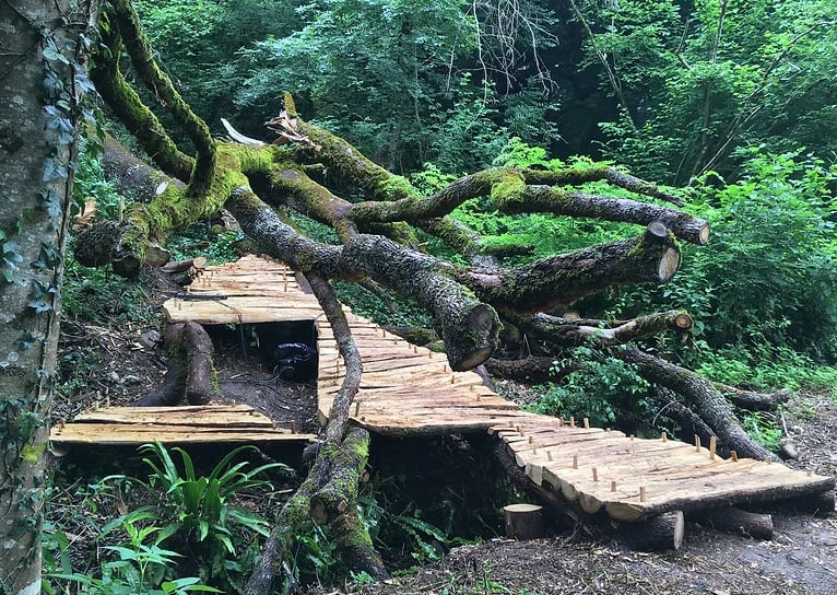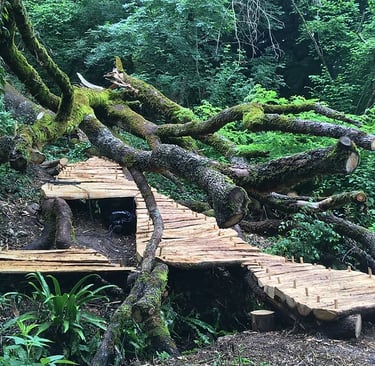 Workshop avec l’artiste Laurent Tixador, création d’un escalier montant dans une forêt à partir de techniques ancestrales, fabrication de briques (presse, cuisson) et de machines à énergies musculaires, Maison Forte à Monbalen.